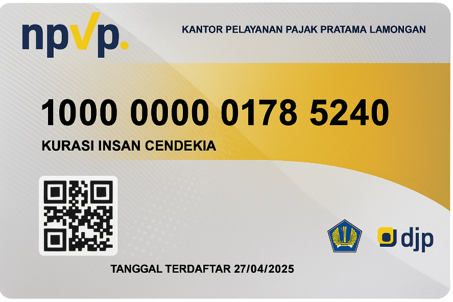 PT Kurasi Insan Cendekia telah memiliki Nomor Pokok Wajib Pajak (NPWP) sebagai bentuk kepatuhan terhadap regulasi perpajakan di Indonesia. NPWP ini menjadi bukti bahwa perusahaan kami terdaftar secara resmi sebagai entitas badan hukum yang menjalankan kegiatan usaha secara sah dan bertanggung jawab.