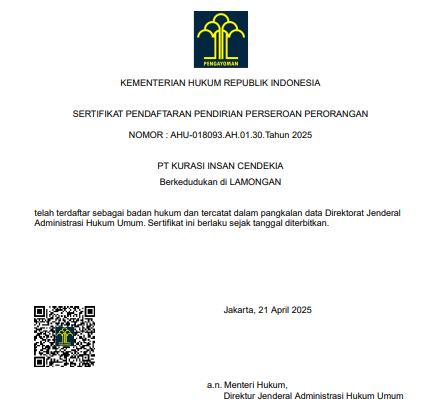 PT Kurasi Insan Cendekia adalah badan hukum resmi yang bergerak di bidang penerbitan jurnal ilmiah dan penyelenggaraan event lomba akademik.Dengan Sertifikat Pendirian Perseroan Perorangan Nomor: AHU-018093.AH.01.30.Tahun 2025, kami berkomitmen untuk menjadi jembatan antara karya intelektual dan wadah prestasi generasi cendekia Indonesia.